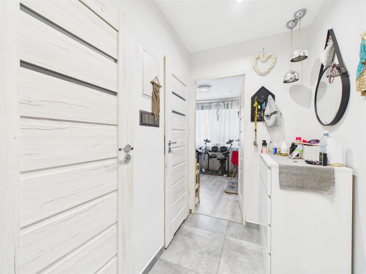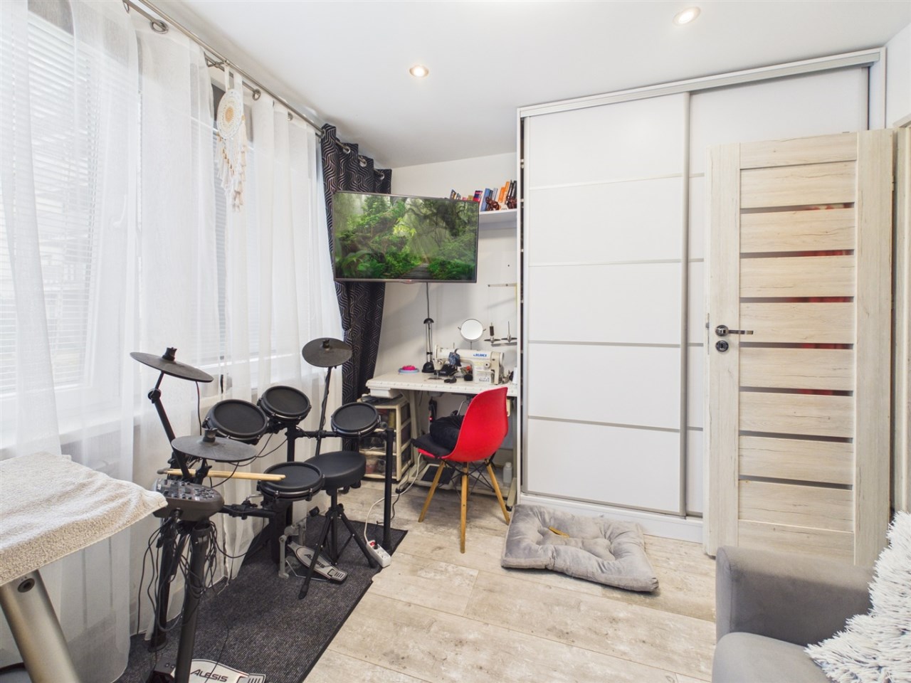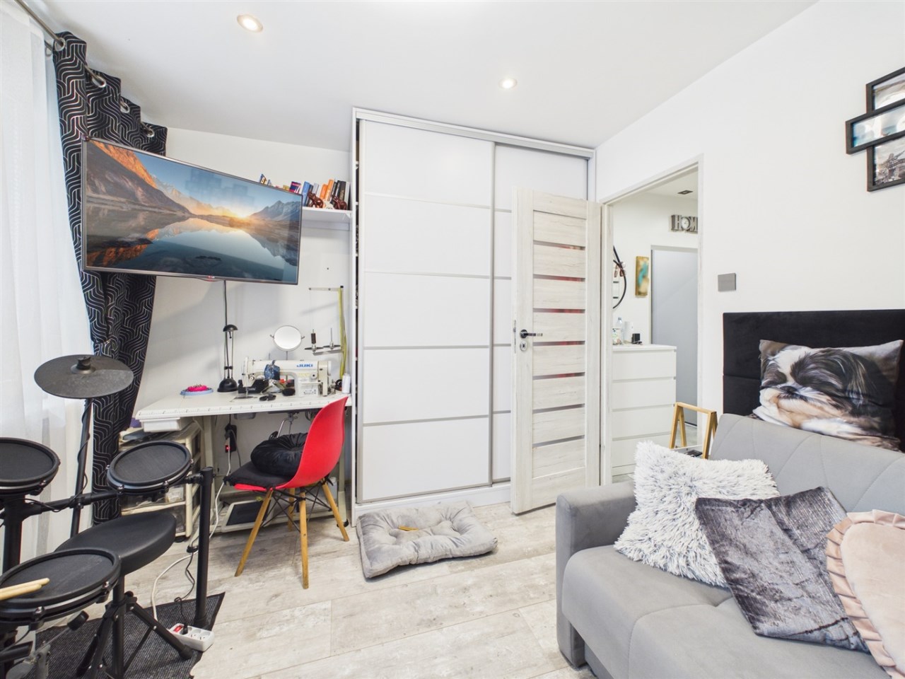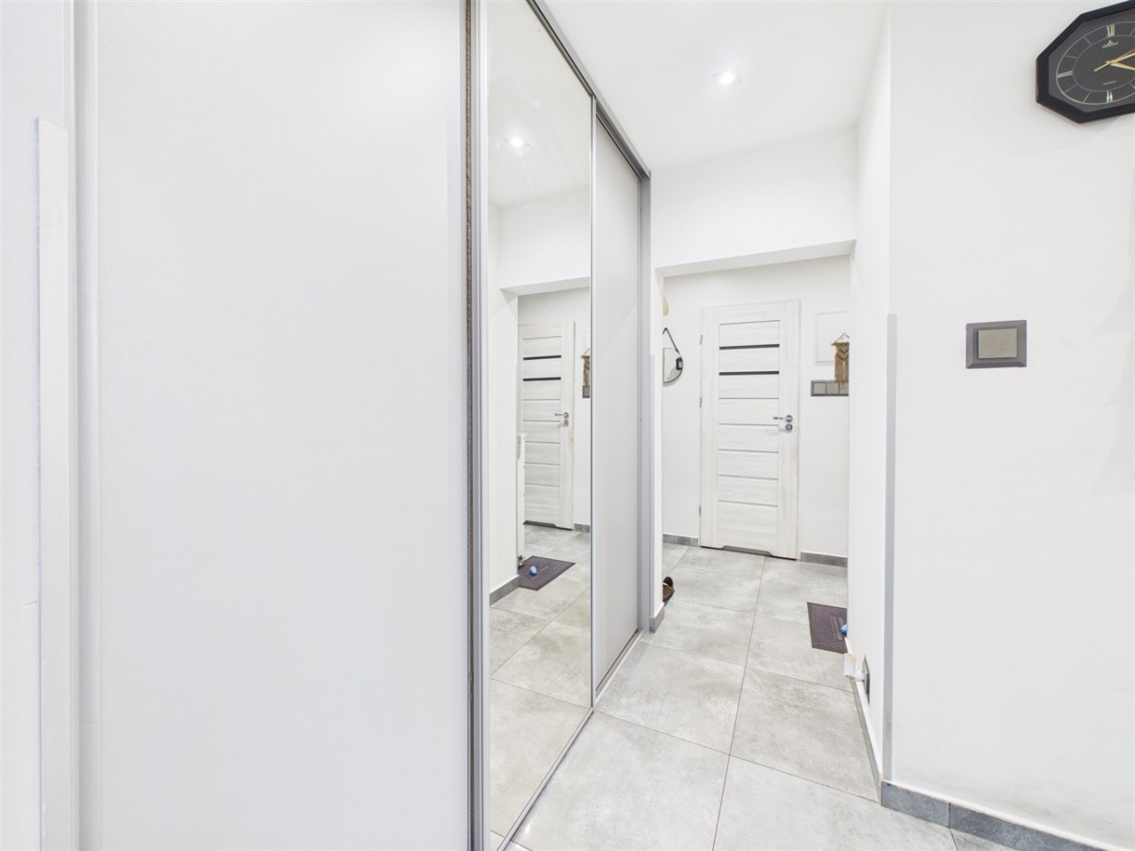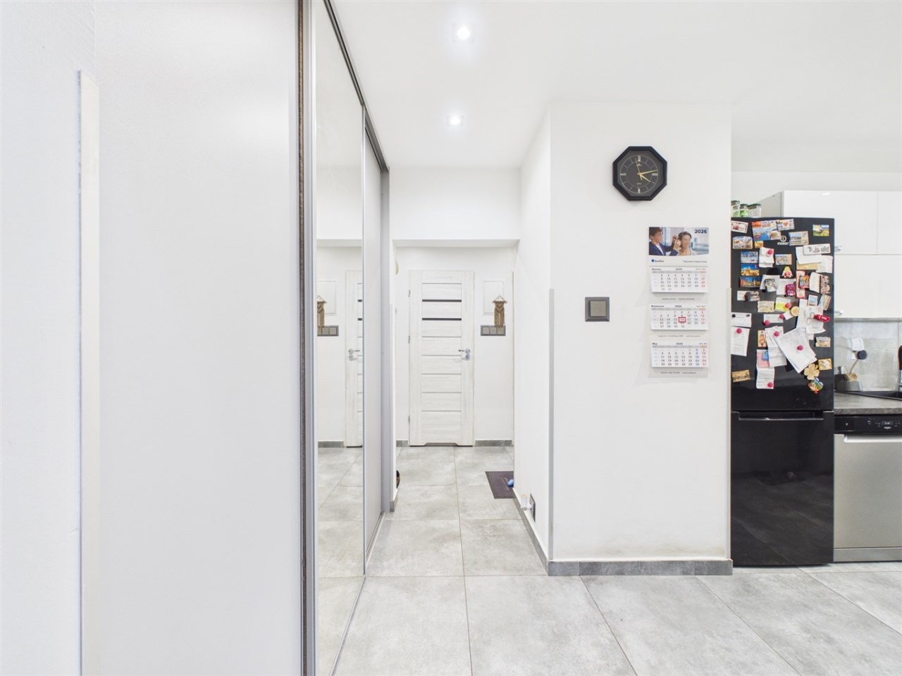 Kuchnia wyposażona jest w zabudowę meblową wraz ze sprzętem AGD, który pozostaje w cenie nieruchomości. Dodatkowym atutem są pojemne szafy w zabudowie – zarówno w przedpokoju, jak i w mniejszym pokoju.