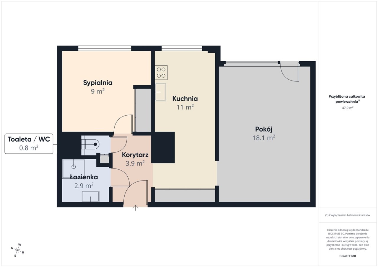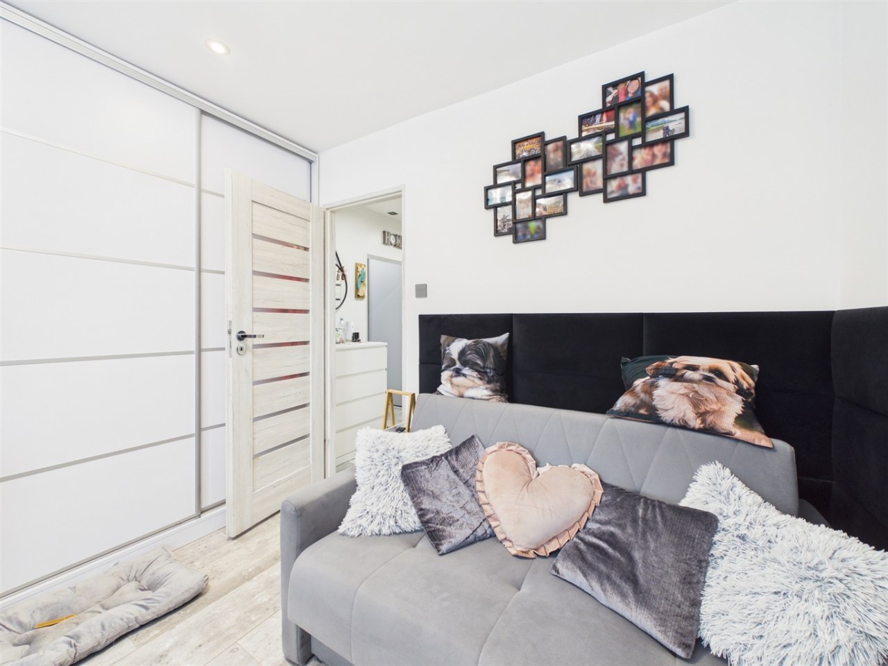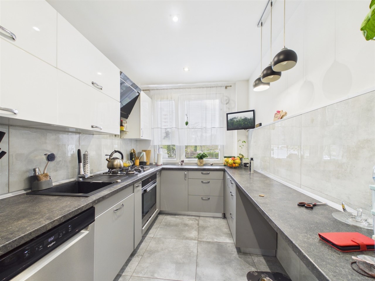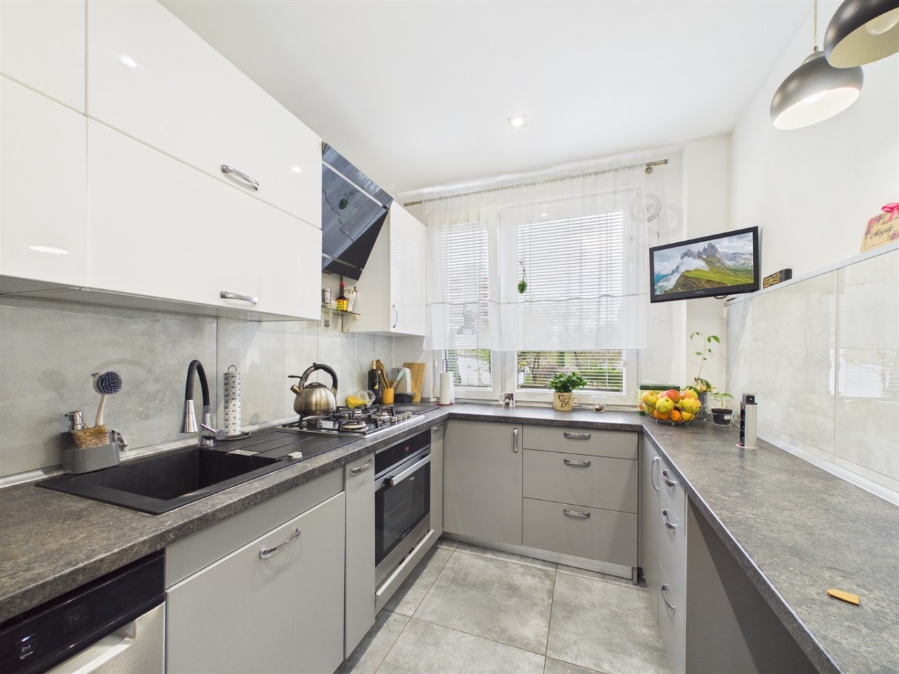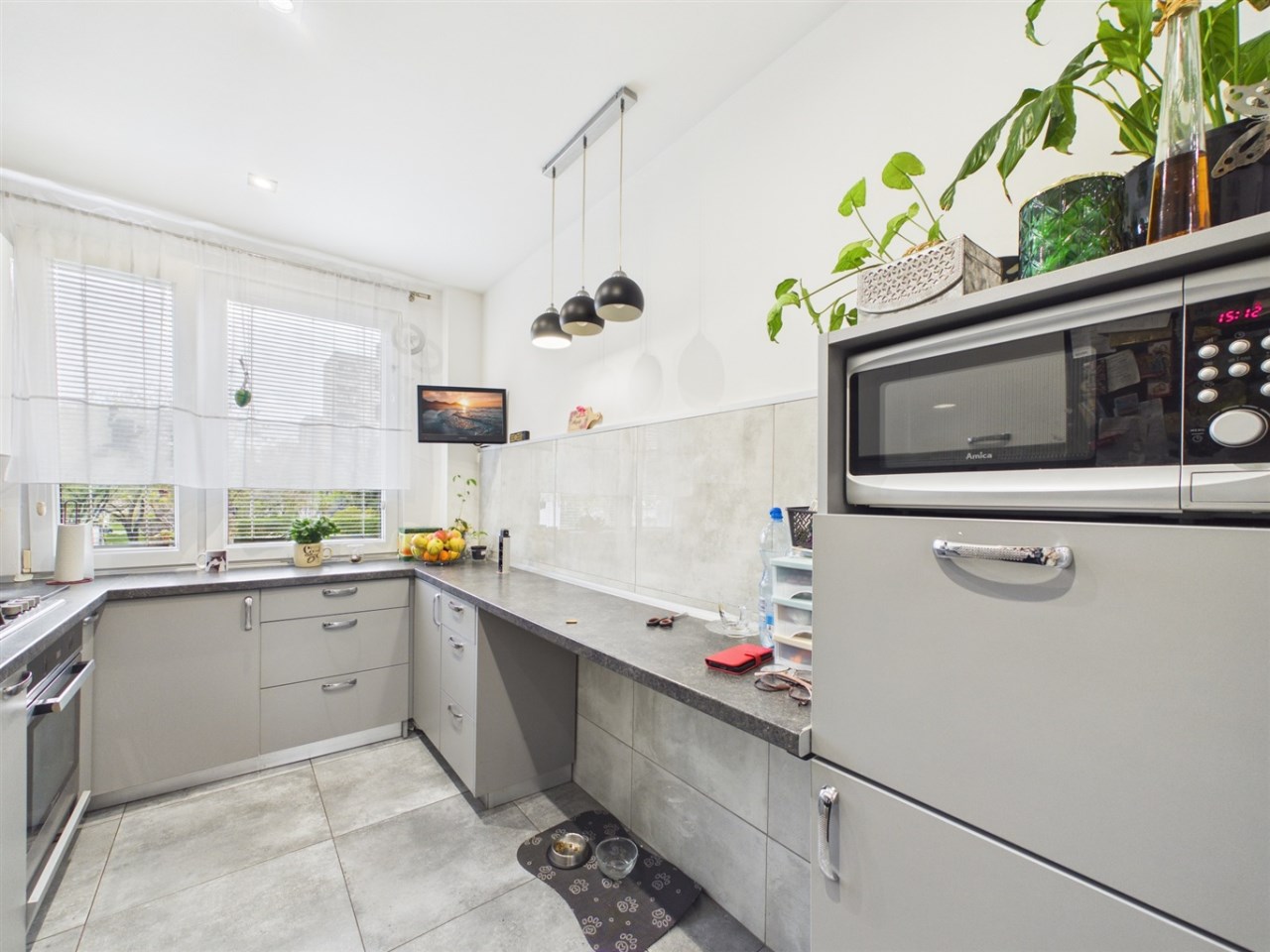 Kuchnia wyposażona jest w zabudowę meblową wraz ze sprzętem AGD, który pozostaje w cenie nieruchomości. Dodatkowym atutem są pojemne szafy w zabudowie – zarówno w przedpokoju, jak i w mniejszym pokoju.