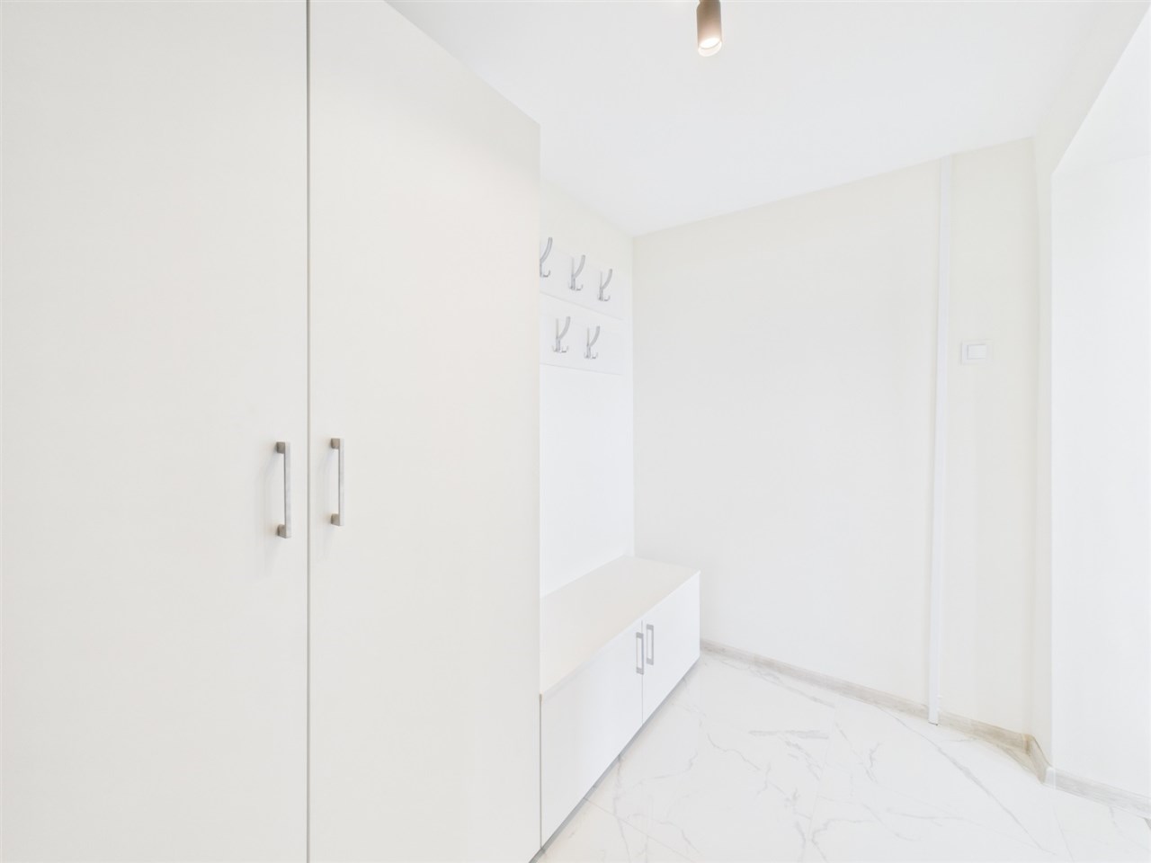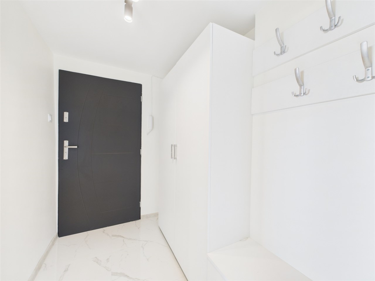 W przedpokoju szafa w zabudowie, również zabudowa meblowa w dodatkowym korytarzu